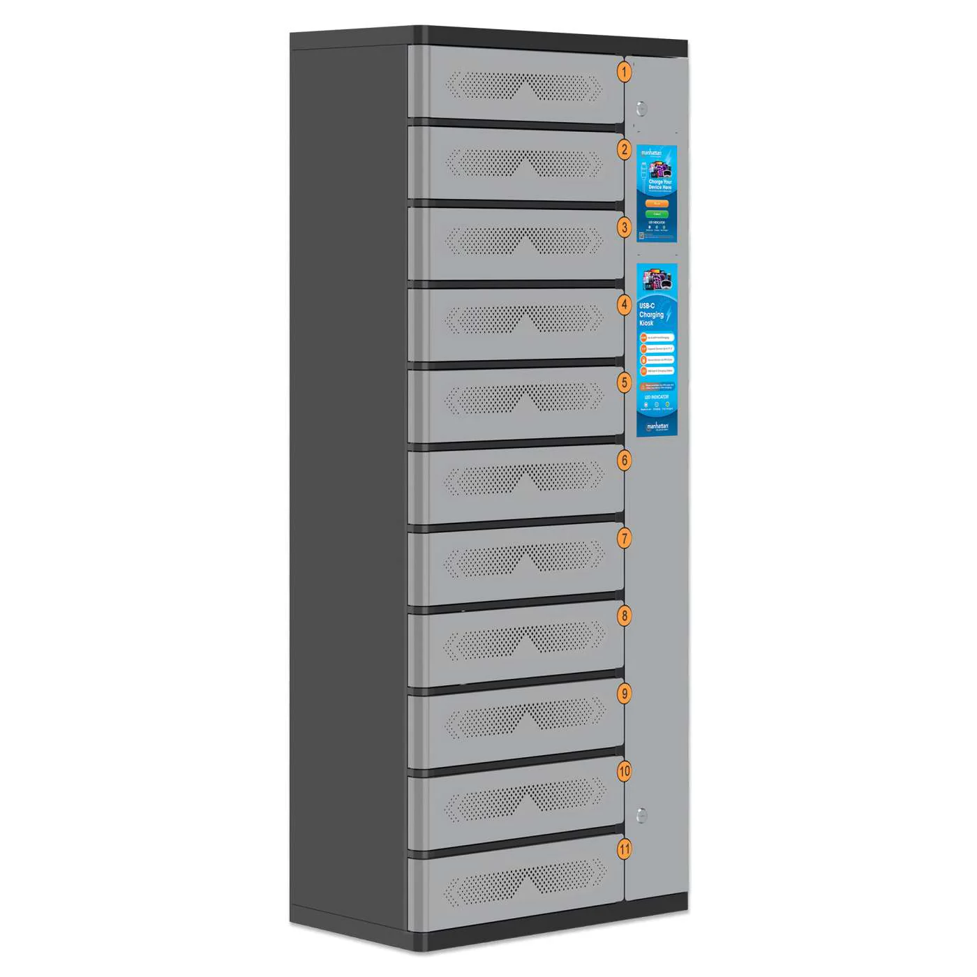 The 11-Compartment USB-C Charging Kiosk from Manhattan offers a smart and efficient way to charge and store multiple devices in one central location. Designed for shared workspaces, lobbies, universities, schools, libraries, restaurants, and other public areas, it provides eleven PIN-secured compartments for laptops, tablets, phones, and other devices up to 17.3". Each user simply places their device inside, closes the door, and sets a personal 1-6 digit PIN for secure, self-service charging.