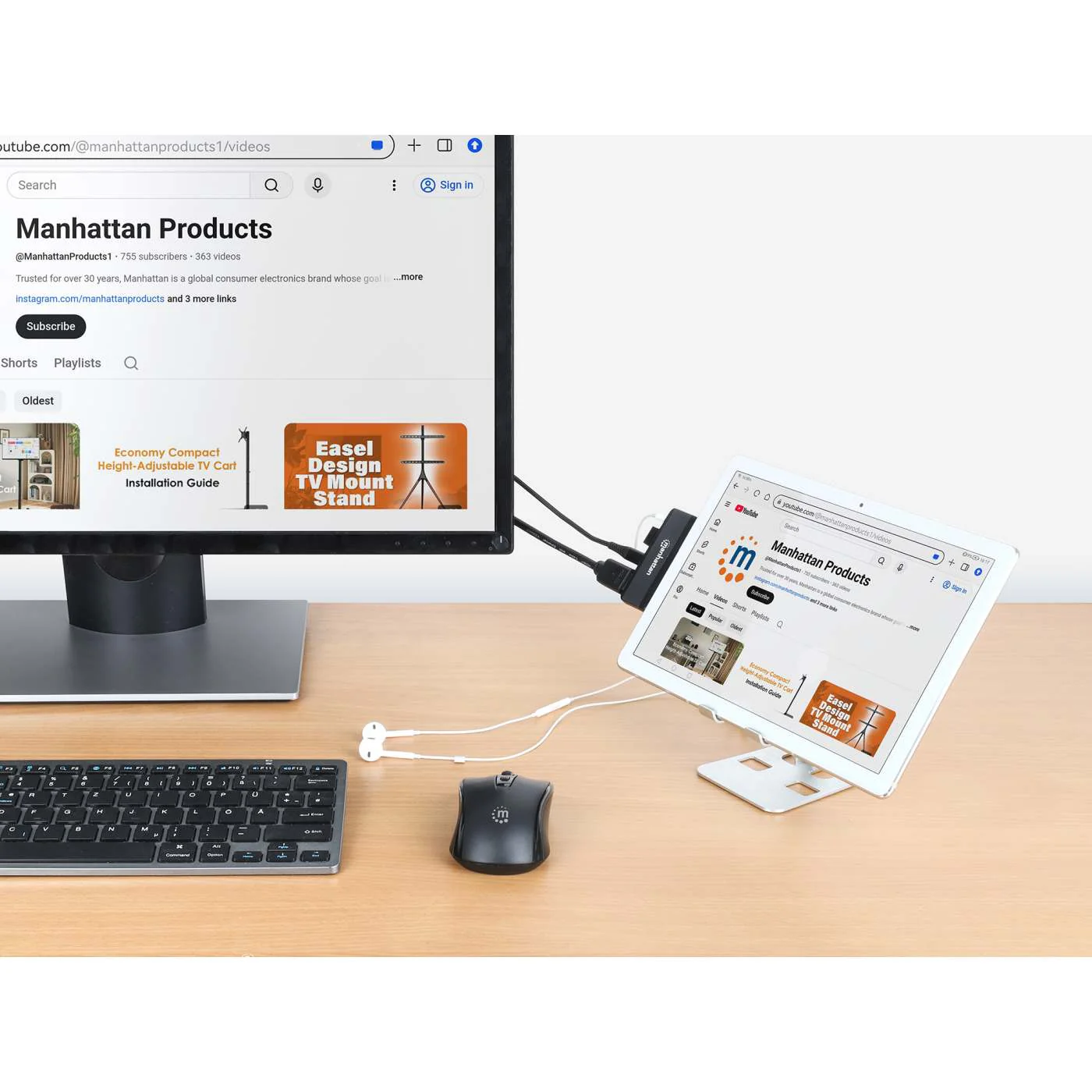 Unlock the full potential of your USB-C device with the Manhattan USB-C to HDMI 4-in-1 Dock. Designed to enhance productivity and convenience, this versatile adapter connects your laptop (or other device) to an HDMI display, a USB-A peripheral, and a headset, all while keeping it charged with up to 100 W of Power Delivery.